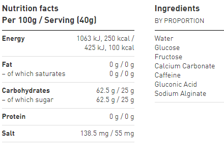 Energy encapsulated in a natural hydrogel. Each serving contains 100 mg of caffeine and delivers 25 grams of carbohydrates. Built with seven ingredients – no added colourants, preservatives or flavours.