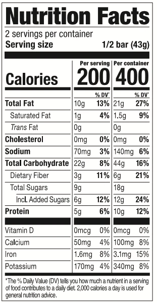 INGREDIENTS*: Organic Brown Rice Syrup, Organic Oats, Organic Peanut Butter (peanuts), Organic Peanuts, Cane Sugar, Unsweetened Chocolate, Organic Sunflower Seeds, Organic Dates, Organic Flax Seeds, Organic Sesame Seeds, Organic Cane Sugar, Cocoa Butter, Organic Brown Rice Crisp (brown rice, cane sugar, sea salt), Organic Expeller Pressed Canola Oil, Vegetable Gycerine, Organic Oat Flour, Peanut Extract, Organic Brown Rice Flour, Sea Salt, Organic Molasses, Organic Pumpkin Seeds, Organic Rosemary Extract
